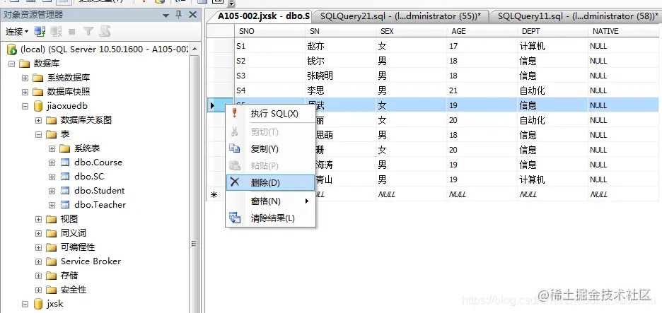 (1) 在“对象资源管理器”窗格中,选择“数据库”→“jxsk”→“表”,右击“dbo.TC”,在弹出的菜单中选择“删除”;