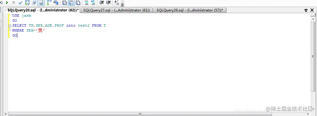 (1) 单击屏幕上方 “工具栏”菜单中的“新建查询”按钮,打开“查询编辑器”窗口,并在“查询编辑器”窗口中输入以下T-SQL语句: