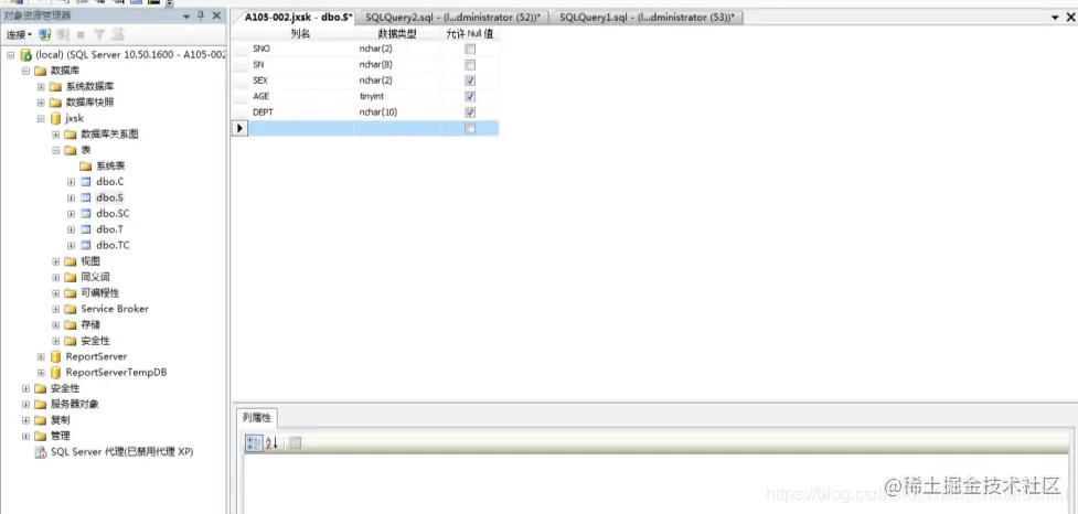 依据上述方式创建学生表“S”,其中依照《SQL Server实验指导(2005版)》中内容,输入各字段定义,如以下两图;