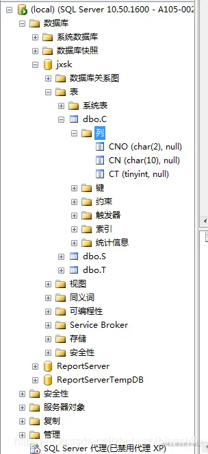 (3) 在“对象资源管理器”窗格中,在“数据库”→“jxsk”→“表”处右键,在弹出的菜单中选择“刷新”选项,可见其所示内容中已存在通过上述方法新建立的数据库表C,如下图;