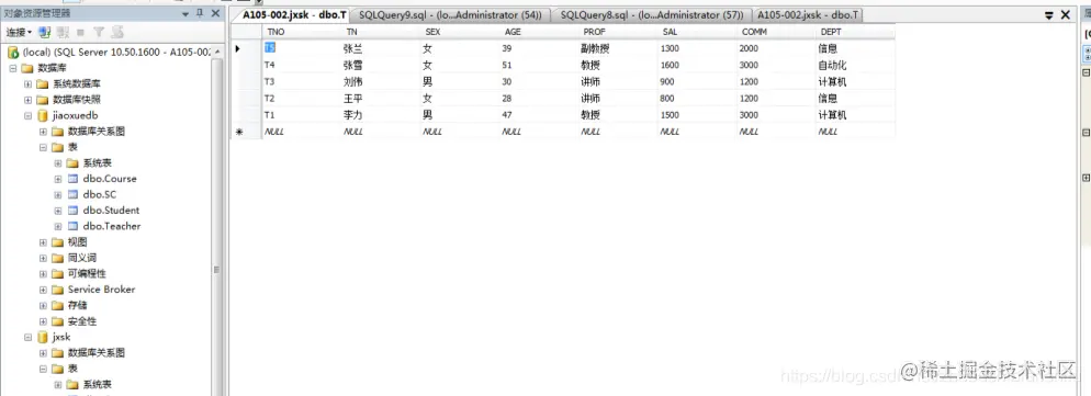 (4) 在“对象资源管理器”窗格中,选择“数据库”→“jxsk”→“表”并右击表T,在弹出的菜单中选择“选择前1000行”可查看表T中内容已对应改变。