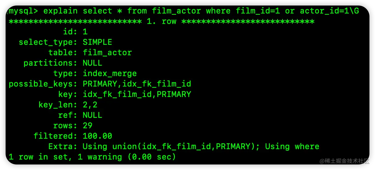 小伙伴们看到,此时 type 是 index_merge,possible_keys 和 key 中,都给出来了两个索引,Extra 中的值为 Using union(idx_fk_film_id,PRIMARY); Using where。