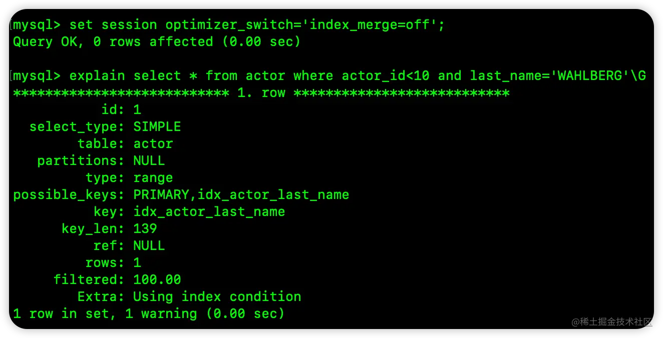 也可以通过 optimizer_switch 来关闭索引合并功能,如下: