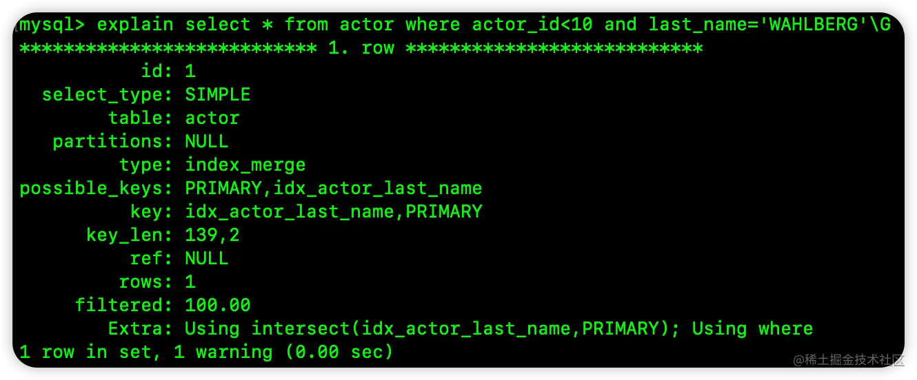 可以看到,用到了索引合并,且是 Using intersect。