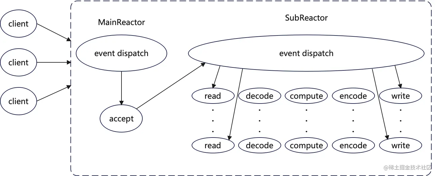 Reactor并发模型还有一种变种,它将客户端连接的接受放在单独的MainReactor中,MainReactor再将客户端连接移交给SubReactor进行读写操作的处理。使用单独的线程来接受客户端连接可以更快地为新的客户端提供服务,因为同时处理的客户端连接数更多,从而提高了服务并发度,从而更好地利用了CPU。Reactor-MS模型的交互简图如下所示。