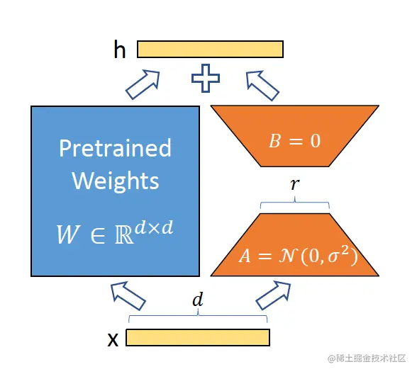 我们将参数分为冻结的权重和可以训练的参数。然后我们把分解成A和B两个可训练参数的矩阵,其中A矩阵取随机值,而B矩阵全取0.