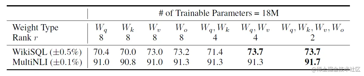 取q和k两组参数的效果,还不如只取v一个的效果好。而把q,k,v,o全都训练了,也没有明显的优势。所以就取相对最有效率的q,v两组。