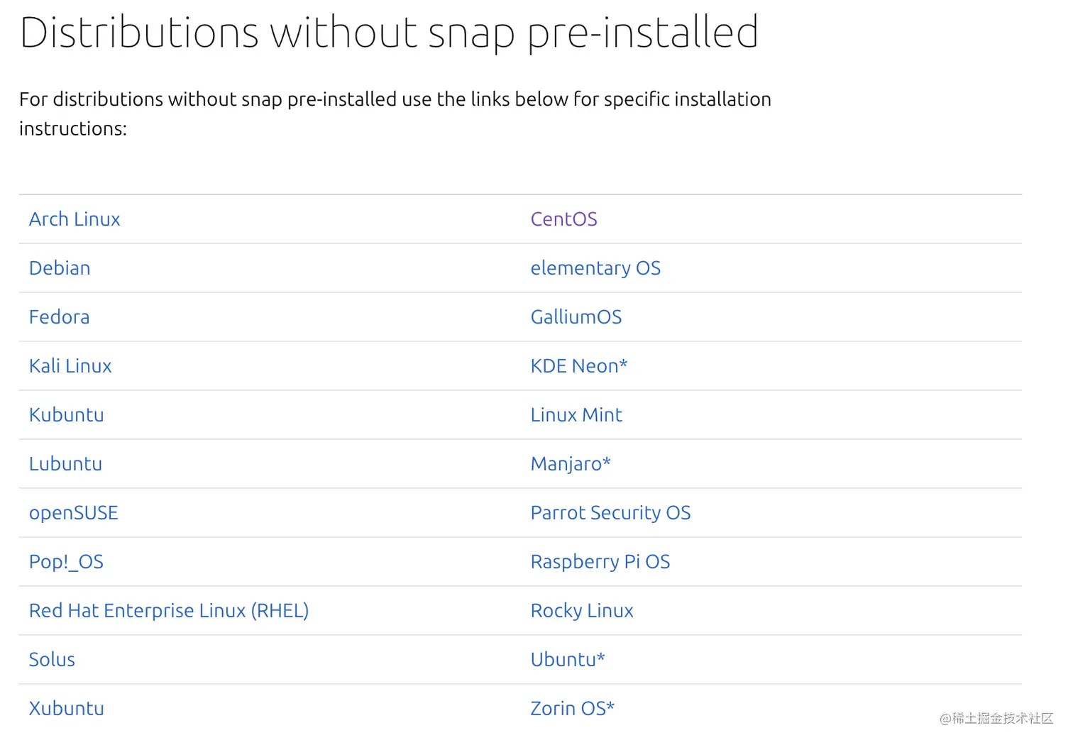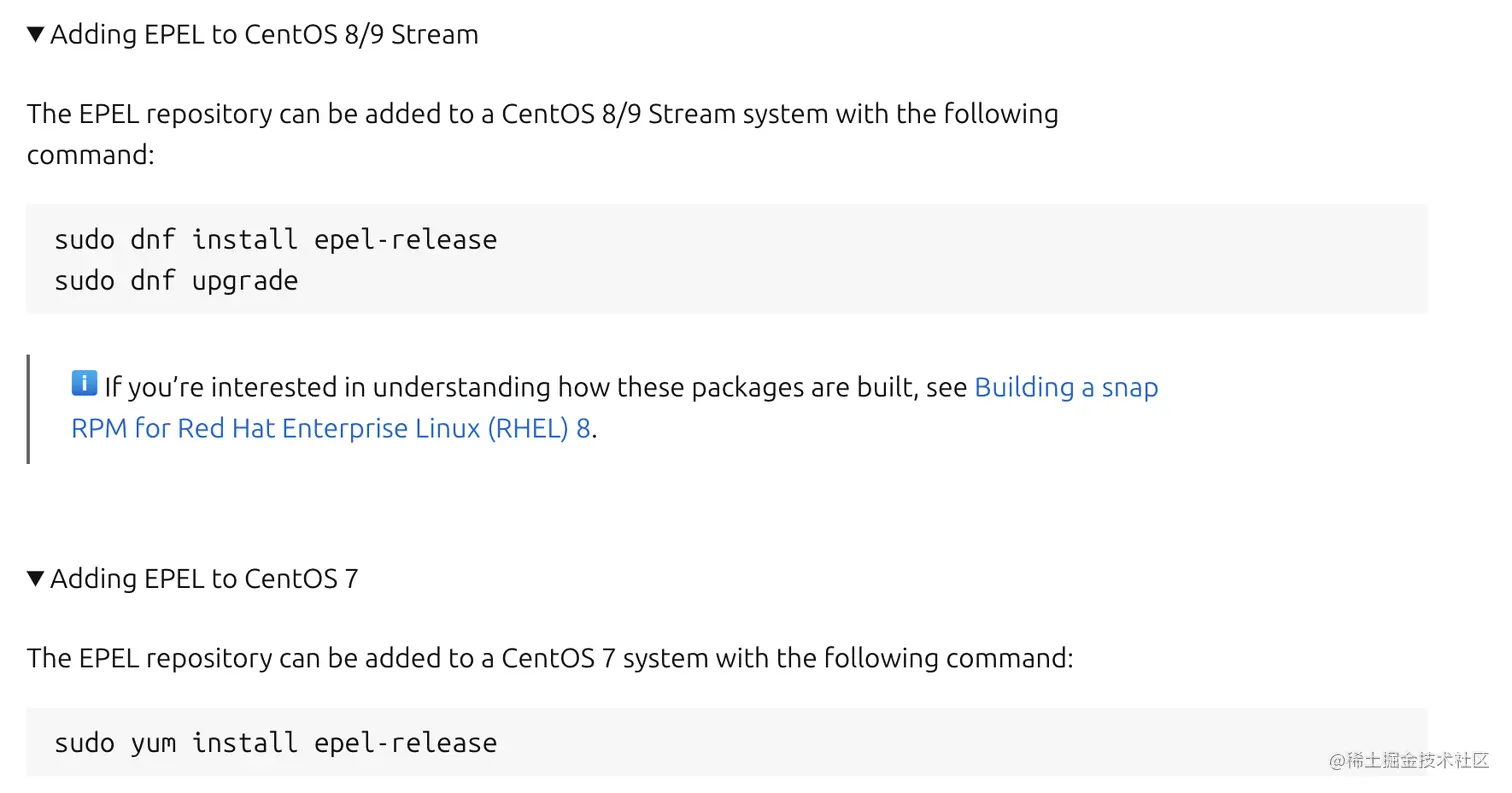 - 阅读CentOS上安装sanp官方文档,官方文档简单介绍了snap可以运行的系统,同时说明了snap在EPEL(简单认为是官方软件库的扩展就行,官方维护的软件有限,因此要安装非官方的软件需要额外添加源),如果不了解EPEL,感兴趣的可以自行科普一下。这里不需要了解EPEL,如果你没有安装过EPEL那一定需要安装EPEL才行,官方文档也给出了各系统版本(查看系统版本,可以使用
