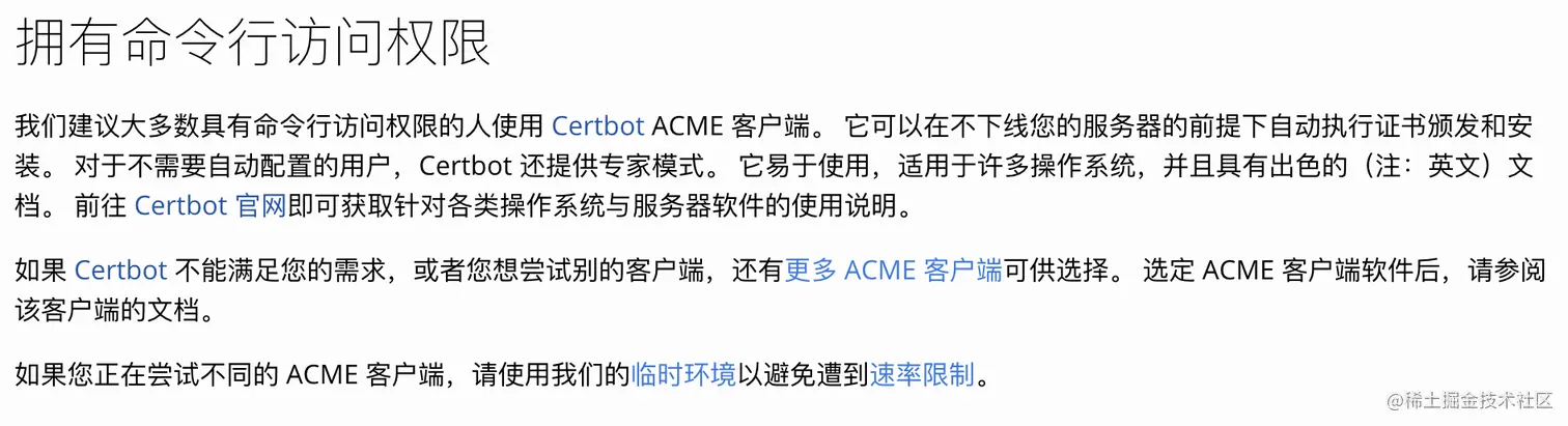 Let's Encrypt入门指南提供两种方式获取https证书,两种方式根据我们对服务器的访问权限来区分,一种是具有命令行访问权限,另一种是没有命令行访问权限的方式,大多数情况下我们都具有命令行访问权限,因此本文章主要详细讲解命令行访问权限的方式;如下图: