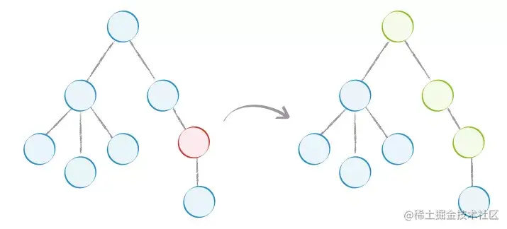 Immutable.is 比较的是两个对象的 hashCode 或 valueOf(对于 JavaScript 对象)。由于 immutable 内部使用了 Trie 数据结构来存储,只要两个对象的 hashCode 相等,值就是一样的。这样的算法避免了深度遍历比较,性能非常好。使用 Immutable 后,如下图,当红色节点的 state 变化后,不会再渲染树中的所有节点,而是只渲染图中绿色的部分: