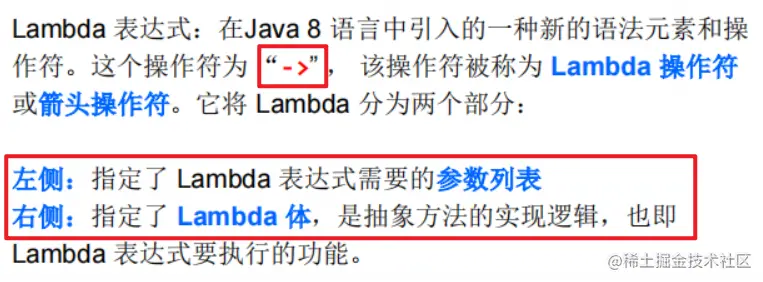 * ->右边:lambda体 (其实就是重写的抽象方法的方法体)