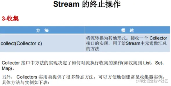 // collect(Collector c)——将流转换为其他形式。接收一个 Collector接口的实现,用于给Stream中元素做汇总的方法