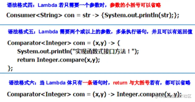 * ->右边:lambda体应该使用一对{}包裹;如果lambda体只有一条执行语句(可能是return语句),省略这一对{}和return关键字