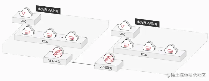 通过VPN将华为云上的不同region的VPC连接,使得用户的数据和服务在不同地域能够互联互通