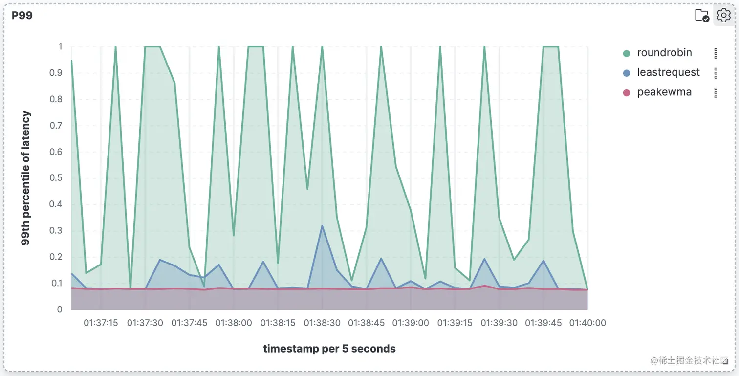 最后,我们使用了Round Robin、Least Request和PeakEWMA三种算法,分别以16并发同时发送请求,得到的P99如下