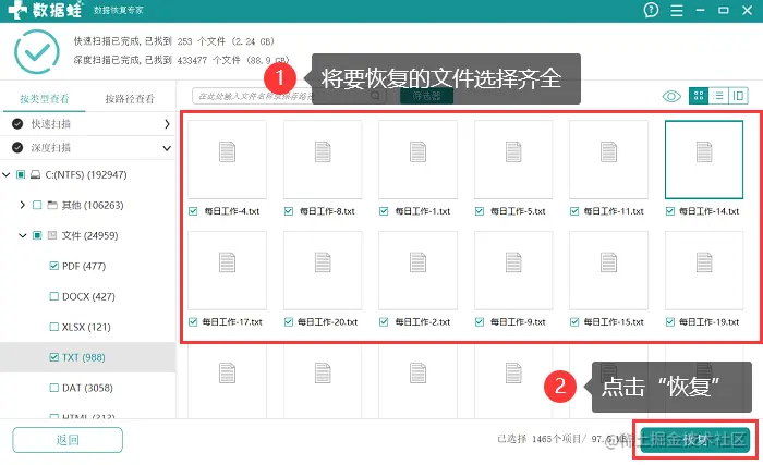 3.深度扫描结束后,将要恢复的文件选择齐全,点击 【恢复】 并选择文件的保存位置。