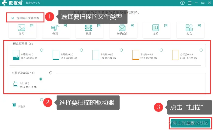 - 安装专业软件,对丢失的数据类型进行选择(最好全选),勾选要扫描的驱动器,点击【扫描】 ;
