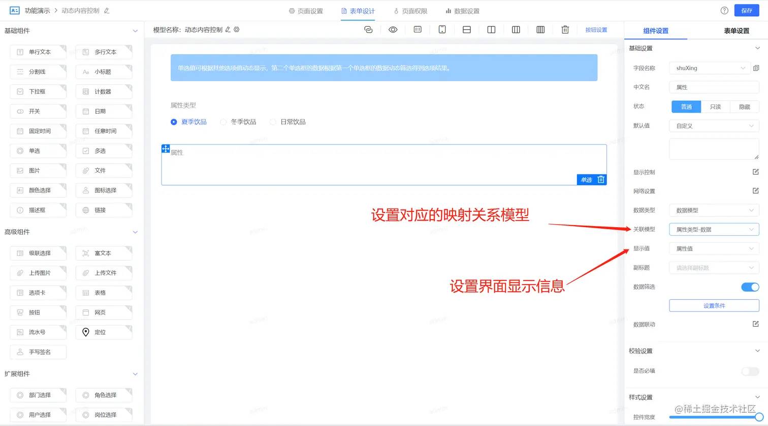 配置的思路:根据第一个单选框选择的内容,通过关联筛选的方式去选择第二个单选框的内容,那么第二个单选框的物理存储模型里边需要包含第一个单选框内容的字段,这样可以通过这个字段进行动态过滤。