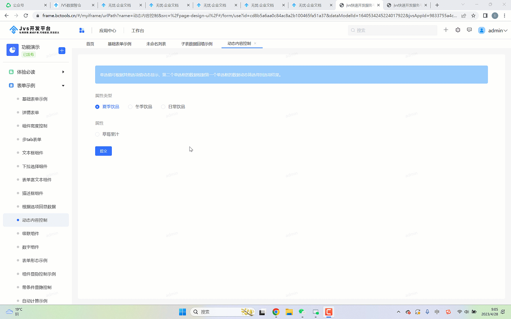 在表单中常常会有动态字段的场景,也就是如下图所示,根据一个字段的内容选项去控制另外字段的内容展示