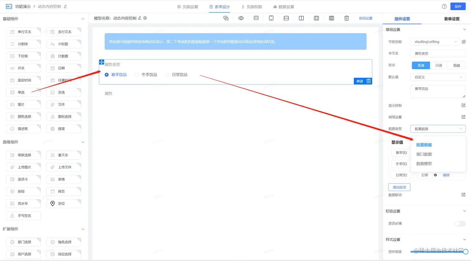 接下来我们看看如何实现两个选择内容的联动配置的