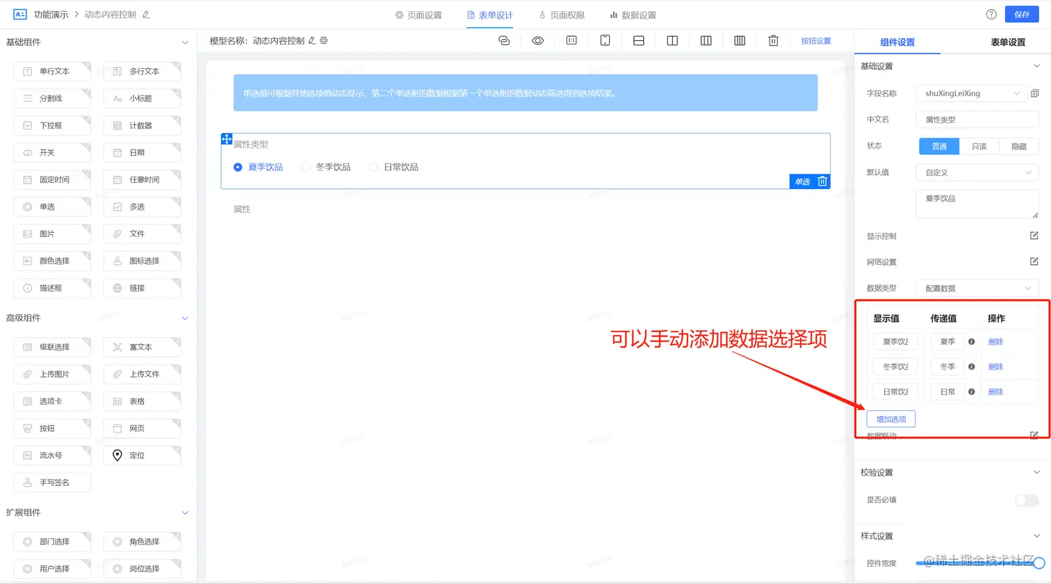 在JVS的表单设计器中,包括多种方式的单选框数据内容来源,可以来源于直接配置、可以来源于外部接口、也可以来源于数据模型(表),这里我们先直接使用配置数据