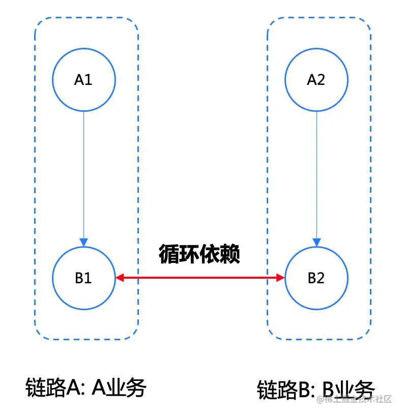 一条链路出问题,导致其他链路故障。当服务B1或B2 性能变差时,最终导致链路A/B都会被影响,严重情况下导致宕机。