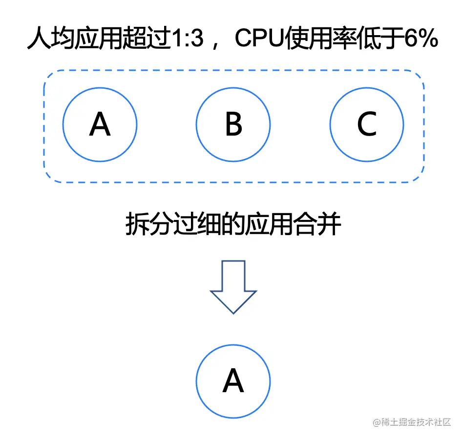 长期:合并拆分过细的应用,参考历史、现状和将来的规划,将拆分过细、CPU使用率长期小于6%的应用做合并。