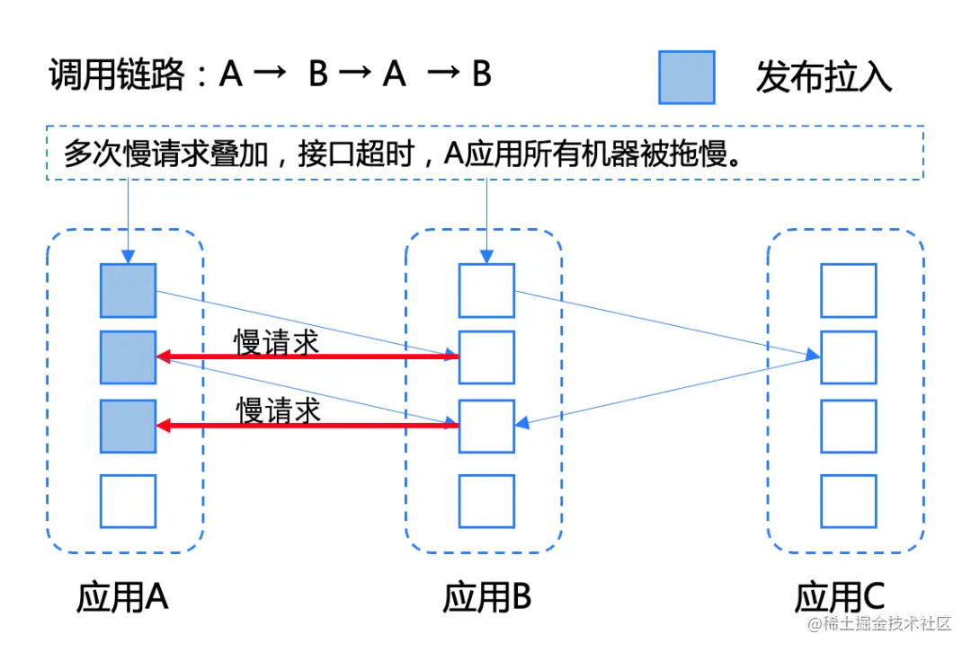 当流量接入时,请求在刚拉入的机器中多次来回调用,因多次慢请求叠加,导致接口越来越慢,机器资源耗尽,一台一台被拖垮,最终整个服务不可用,产生雪崩(如下图)。