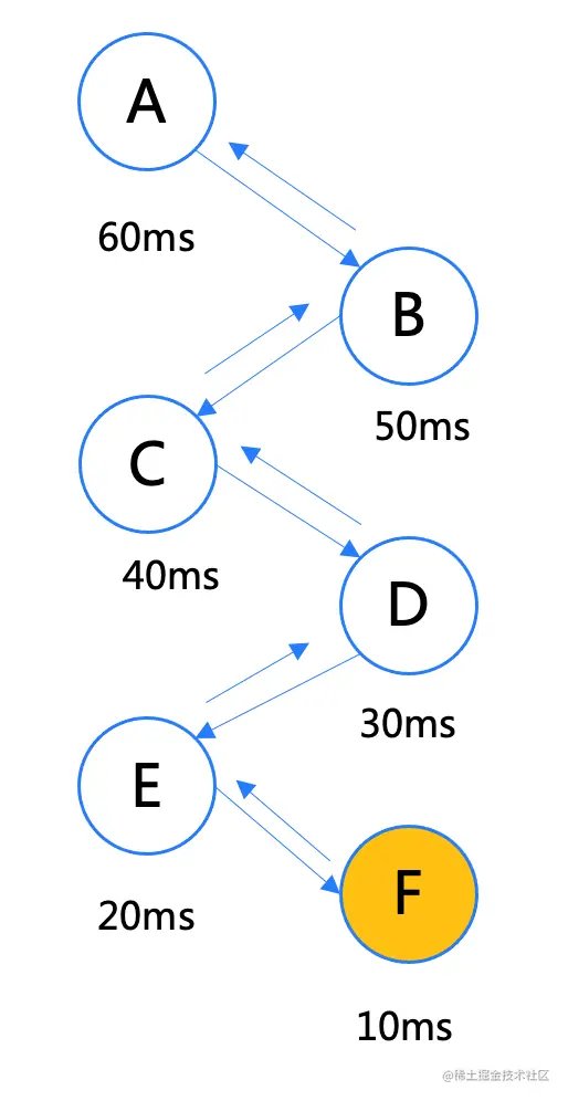 链路太长,定位问题困难(效率低),当服务F出现故障时,下游A~E 应用 owner 需要排查原因。