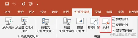 步骤2: 点击PPT菜单栏上的【幻灯片放映】,点击【录制】。