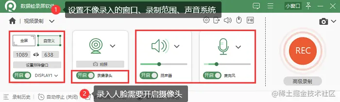 步骤2: 进入软件的【视频录制】模式,您可以排除不想录入的窗口、设置录制的区域、麦克风、扬声器。怎么录制自己露脸的讲课视频?需要进行带人脸的教学视频录制,可以开启摄像头。