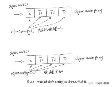 注意下打印结果,T2调用notify方法之后,T1并不能立即继续执行,而是要等待T2释放objec投递锁之后,T1重新成功获取锁后,才能继续执行。因此最后2行日志相差了2秒(因为T2调用notify方法后休眠了2秒)。