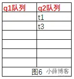 t5会获取到obj的锁,然后执行notifyAll()方法,系统会将队列q1中的线程都移到q2中,如图6,t5线程执行完毕之后,会释放obj的锁,此时队列q2中的t1、t3会争抢obj的锁,争抢到的继续执行,未增强到的带锁释放之后,系统会通知q2中的线程继续争抢索,然后继续执行,最后两个队列中都为空了。