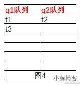 t4会获取到obj的锁,然后执行notify()方法,系统会从q1队列中随机取一个线程,将其加入到q2队列,假如t2运气比较好,被随机到了,然后t2进入了q2队列,如图4,进入q2的队列的锁才有资格争抢obj的锁,t4线程执行完毕之后,会释放obj的锁,此时队列q2中的t2会获取到obj的锁,然后继续执行,执行完毕之后,q1中包含t1、t3,q2队列为空,如图5
