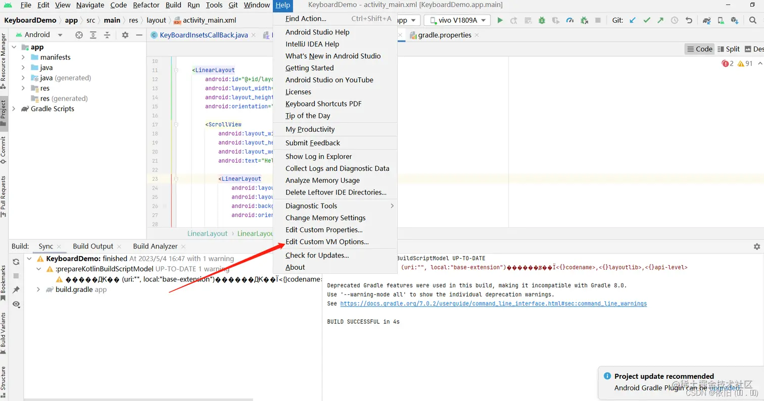 Android Studio 编译时窗口出现乱码解决方案 舒呐 2023-05-08 205 阅读1分钟 1、乱码情形 2、解决方案 点击Help -----》Edit Custom VM Options... 打开studio64.exe.vmoptions文件 输入**-Dfile.encoding=UTF-8,注意设置完成重启AS生效**