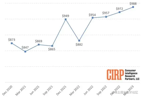 近日根据调研公司公布的数据显示,全球智能手机市场表现整体下行,不过高端手机近三年同比都呈现增长趋势,尤其是 600 美元以上的机型。市场研究机构 CIRP 的数据报告显示在 2023 年第一季度 iPhone 的平均售价达到 988 美元 ( 约合人民币 6837 元 ) ,同比增长 12%,创历史新高,其中 iPhone 14 Pro 以及 iPhone 14 Pro Max 是 iPhone 系列最受欢迎的型号,虽然两款手机价格相对较高,但还是占据了总销量的近一半。去年同期 iPhone 的平均售价为 882 美元,2021 年的收尾价为 847 美元。