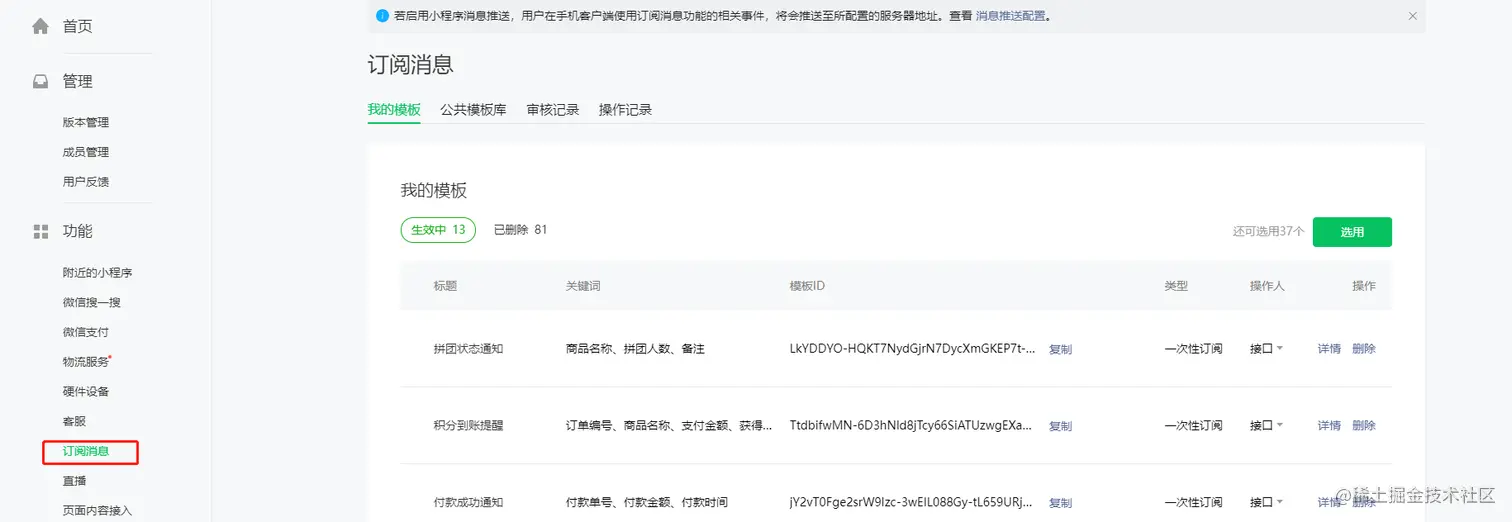 6、一致:清掉小程序后台所有订阅消息,重新同步(eb_template_message 表清掉所有kid字段),不一致:清缓存重新试一次)
