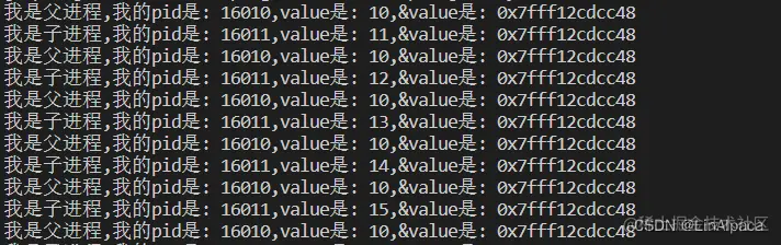 🎃可以观察到,父子进程都有一个 value 值,且共用一个地址。而子进程改变 value 时父进程的 value 却不受影响。