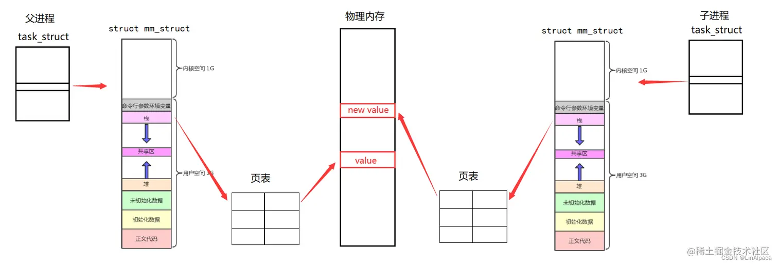 🎃若子进程对值进行修改,便会触发写时拷贝,在物理内存的新地址中拷贝一份新的值进行修改,之后修改页表的映射,指向这块区域。
