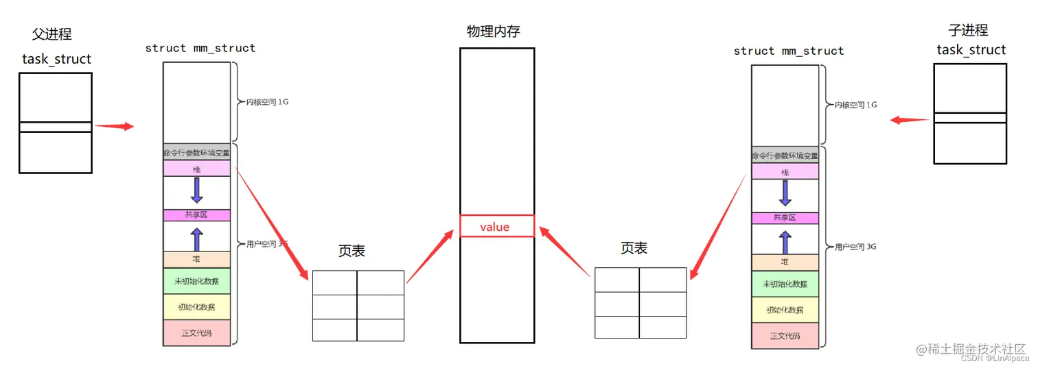 🎃之后父进程创建了子进程,子进程会继承父进程的进程地址空间,因此二者存储 value 的虚拟地址是相同的,并映射到同一块物理内存。若子进程未进行写入,则两个进程便会保持原有的映射关系。