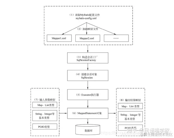 1、读取MyBatis配置文件:mybatis-config.xml为MyBatis的全局配置文件,配置了MyBatis的运行环境等信息,例如数据库连接信息。