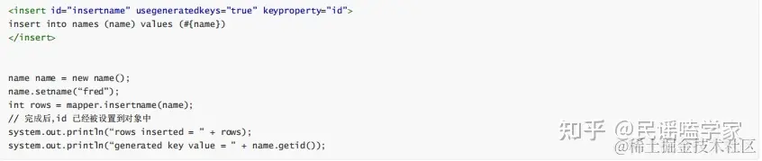 如果采用自增长策略,自动生成的键 值在insert方法执行完后可以被设置到传入的参数对象中 。