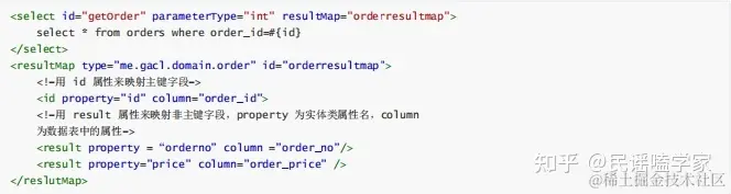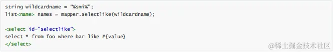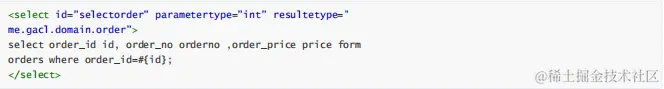 <select id=”selectuser” resulttype=”user”> select id, username, hashedpassword from some_table where username = #{username} and hashedpassword = #{hashedpassword} </select>