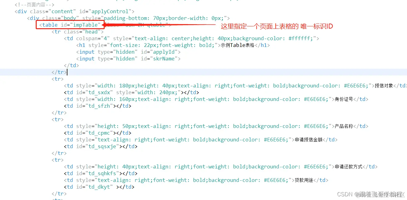 1、先创建 html 的表格,并指定表格唯一ID:impTable编辑