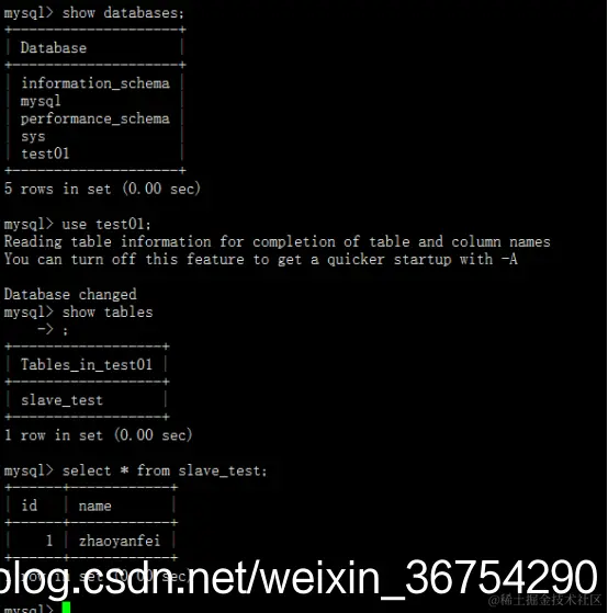 mysql> insert into slave_test values(000001,'zhaoyanfei');