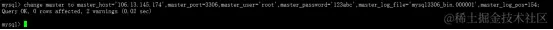 change master to master_host='106.13.145.174',master_port=3306,master_user='root',master_password='123abc',master_log_file='mysql3306_bin.000001',master_log_pos=154;