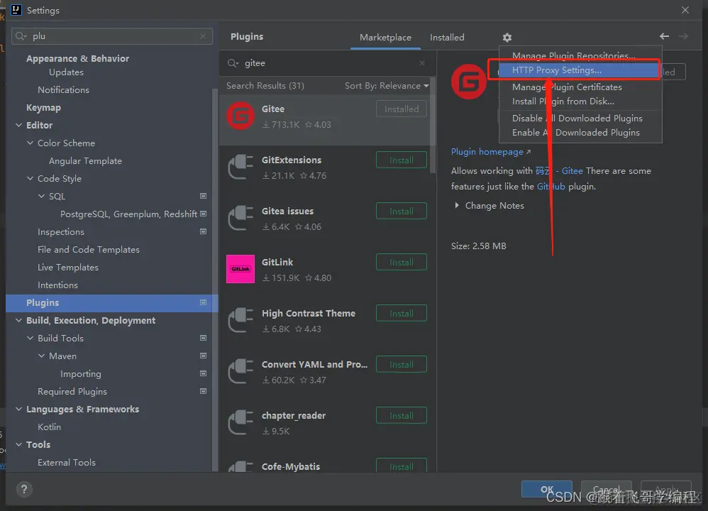 这里可能你初次使用 Idea 搜索Marketplace 会无法搜索,那么需要点击右上角的设置按钮,设置代理访问。