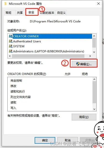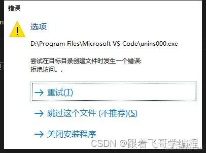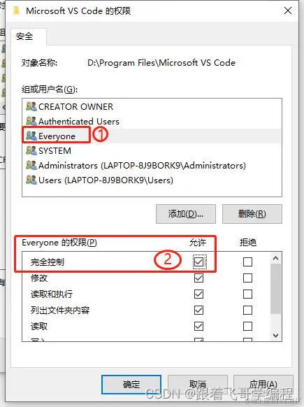 vsCode 打开界面报错,尝试在目标目录创建文件时发生一个错误 跟着飞哥学编程 2023-05-08 632 阅读1分钟 目录 一、报错提示: 二、解决方案: 一、报错提示: 尝试在目标目录创建文件时发生一个错误:拒绝访问 二、解决方案: 拒绝访问的原因就是权限不足导致。 1、找到上图报错提示的 VS Code 安装目录右键点击属性设置权限。 2、添加一个用户 Everyone 3、赋予 Everyone 用户完全控制权限。