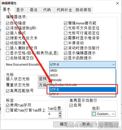 - 工具 -> 编辑器选项 -> 基本 -> 将New Document Encoding选为UTF-8