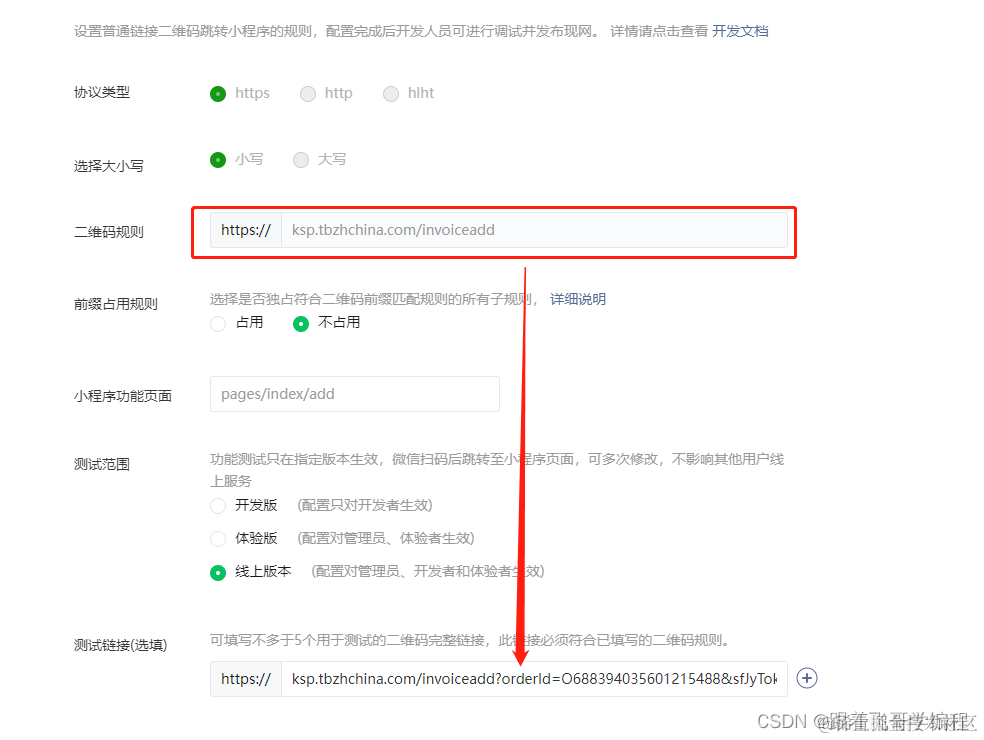 这里可能大家会问如何传参呢,我们设置二维码路径只需要有前缀区分就行,下图中可以看到我的测试链接地址,传参就按照get请求正常传参即可。